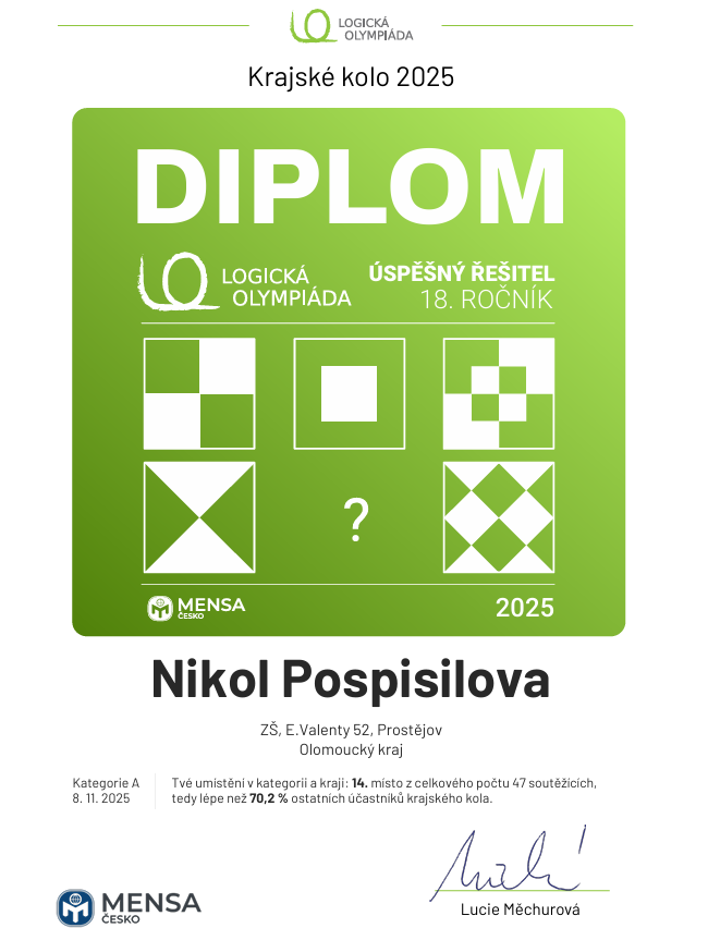 Gratulujeme Nikol Pospíšilové z 5.B k úspěchu v Logické olympiádě. Ze školního kola se ve své kategorii dostala do krajského kola, kde obsadila pěkné 14. místo z celkového počtu 47 soutěžících.