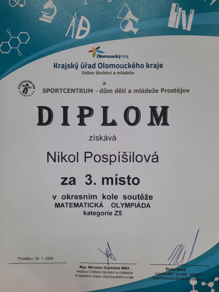 Nikol Pospíšilová z 5.B nás úspěšně reprezentovala v okresním kole matematické olympiády, kde obsadila krásné 3. místo!