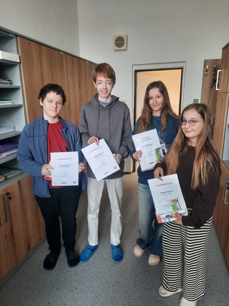 Účastníci školního kola matematické olympiády Natálie Uhrová z 6.A, Ema Mihalčinová ze 7.B, Jakub Bubeník a Martin Mikeš z 8.B. Do okresního kola se probojovala Ema Mihalčinová, které přejeme 1.4.2026 hodně štěstí.