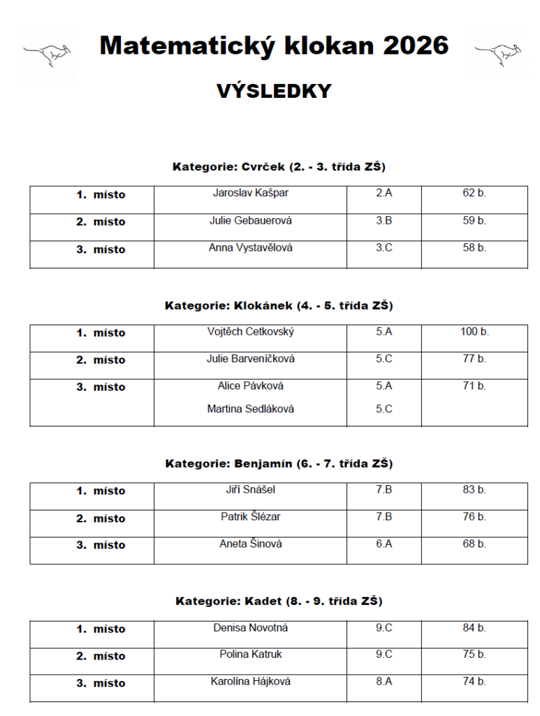 Vítězové soutěže MATEMATICKÝ KLOKAN 2026. Zúčastnilo přes 400 žáků naší školy ve čtyřech kategoriích Cvrček, Klokánek, Benjamín a Kadet.